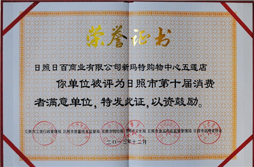 新瑪特購(gòu)物中心五蓮店獲日照市第十屆消費(fèi)者滿意單位